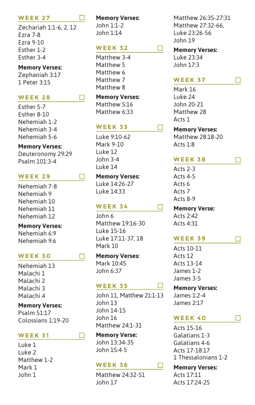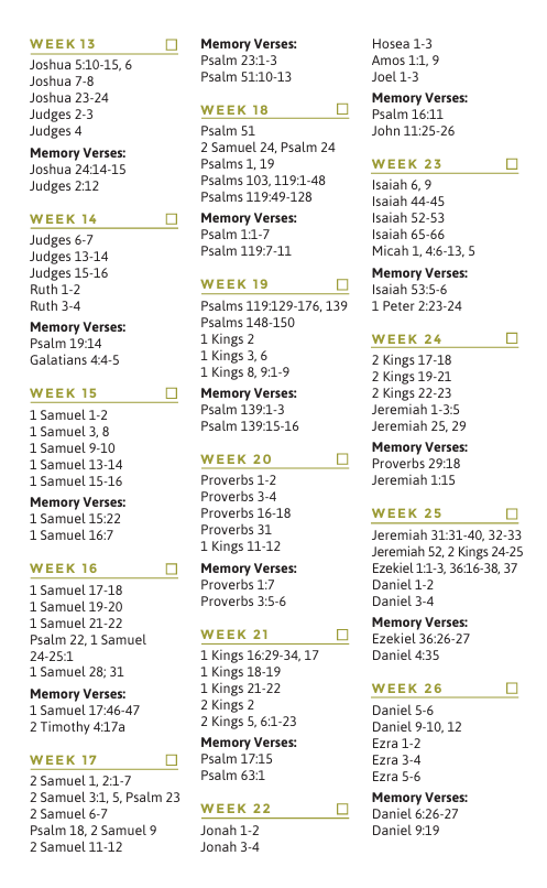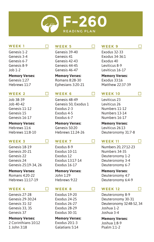 With the F260 reading plan, you can read through the entire Bible in 260 days. The plan is broken down into 52 weeks. Each week has 5 days worth of reading. The plan also comes with verses to memorize each week. The F260 is great for individual reading or as an outline for a D-Group. Click the button below for a pdf version of the plan.